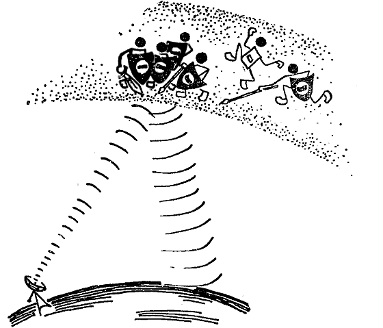 Однако против волн порядка 10 метров и короче эта грозная броня оказывается бессильной. Они свободно ее пронзают и покидают Землю. В чем тут секрет? Его можно раскрыть, наблюдая массовый танец электронов в ионосфере при вторжении волны. Да, да — именно танец. Пока длина волны больше 10 метров, эти воинственные танцоры успевают плясать ритмично с гармонически извивающейся приходящей волной. Каждый танцор имеет заряд. Ритмичное движение этих зарядов создает в ионосфере свое электромагнитное поле; его называют противополем. Взаимодействие приходящего поля и противополя приводит к отражению радиоволн. При более высоких частотах, или волнах менее 10 метров, ритм танца становится для исполнителей бешеным: ведь это десятки миллионов па в секунду! Даже электроны оказываются для этого слишком неуклюжими. Они задыхаются и прекращают танец. Противополе исчезает. Волны свободно уходят в космос. Однако и для таких ультракоротких волн природа воздвигла серьезный барьер. Оказалось, что верхнюю границу этим волнам создает неожиданно нижний слой брони — тропосфера. При длине волны порядка одного сантиметра тропосфера сильно поглощает радиоволны, и они уже не достигают ионосферы. При этом основным поглотителем являются капли влаги, водяные пары, снежинки и т. п.