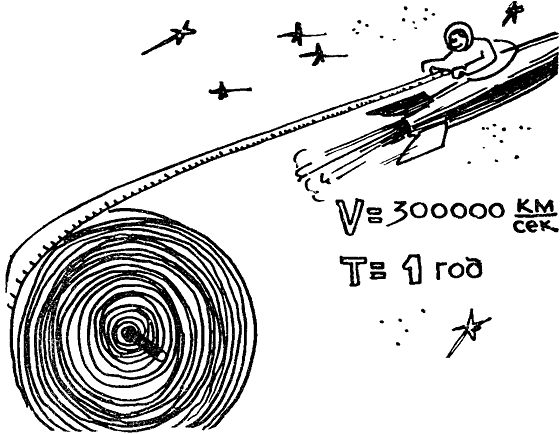 Единицей расстояний стал путь, который пробегает световой луч не за секунду, и не за час, и не за сутки, а за… год! Имя этой единице — световой год. Лента с «космической рулетки» в один световой год будет сматываться целый год, если ее начало ухитриться зацепить за световой луч или квант. Но если зацепим начало нашей ленты за современный космический корабль, летящий со второй космической скоростью (11,19 километра в секунду), то ему придется разматывать ленту длиной в один световой год ни много ни мало — 27 000 лет!