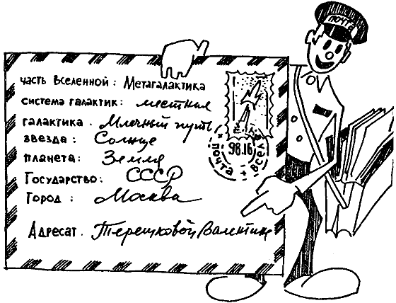 Как упражнение к этому разделу давайте вместе, читатель, составим адрес жителя нашей планеты. Письмо пусть следует к нам из области вселенной, лежащей за пределами Метагалактики. Получателем письма пусть будет первая в солнечной системе женщина летчик-космонавт, имя которой вместе с именем Юрия Гагарина перешагнет, наверное, пределы солнечной системы.
