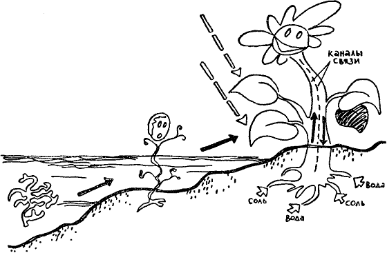 Процесс освоения суши был длительным и, как сказано в одном исследовании, «стоившим многих жертв». В самом деле, ведь переход на сушу полностью преобразил растительные формы, плававшие в бульоне. Появились корни для добывания воды и солей из почвы. Появились листья — уловители и преобразователи солнечной энергии (нашим миниатюрным транзисторам еще очень далеко до этих природных приемников лучистой энергии и по красоте, и по габаритам, и по надежности). Появился объединяющий стебель с массой тончайших капиллярных каналов связи, по которым вверх и вниз непрерывно движется эликсир жизни, а также кора — эта броня растения, защищающая эликсир от испарения, а само растение от солнечных ожогов.