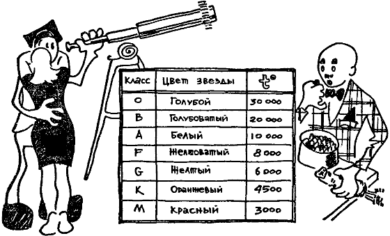По характеру излучаемого спектра звезды разбиты на семь спектральных классов. Запомнить последовательность классов легко, если воспользоваться плодами студенческой смекалки. Их дают первые буквы слов в фразах: «Один битый англичанин финики жевал, как морковь» — для русского алфавита, «Oh be a fine girl, kiss me!» («О, будь хорошей девочкой, поцелуй меня») — для английского алфавита. Эти классы даны в таблице.