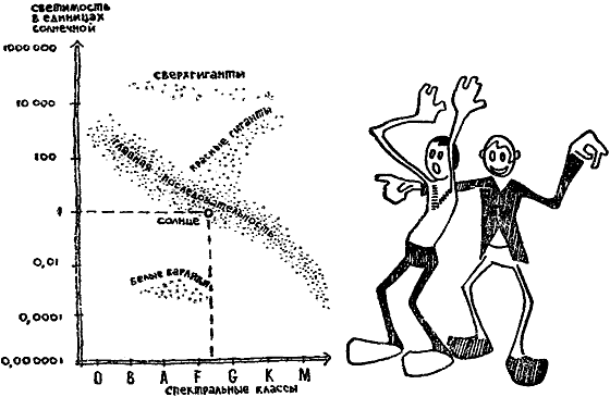 Кроме главной, мы видим на диаграмме ряд других последовательностей (сверхгиганты, красные гиганты, белые карлики). Как следует из диаграммы, наше Солнце находится в центральной части главной последовательности (класс G).