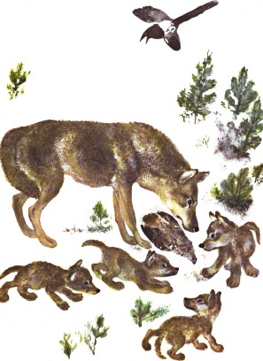 Волчонки тем временем вернулись, добычу съели, сороке ничего не оставили.