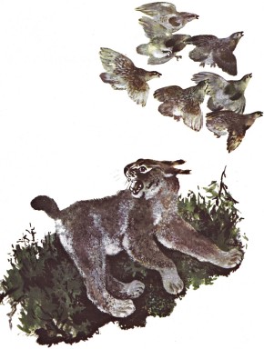 Куры услыхали, на крыло поднялись. Рысь прыгнула, да так никого и не ухватила.