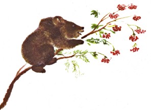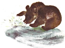 Сидит медведица на полянке. Порявкивает. Недовольна она, не слушают её мишки. Балуются. Один по луже бьёт лапами – брызги летят! Медвежонку это нравится. Другой на рябине качается, как на качелях.