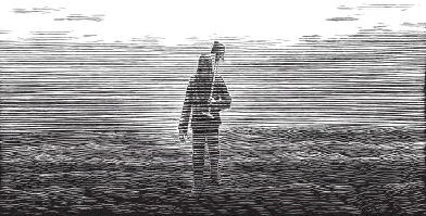 Позже, когда начало светлеть я увидел впереди домик, который смутно виднелся сквозь туман. Высокий худой человек с лопатой на плече вышел из его дверей.
