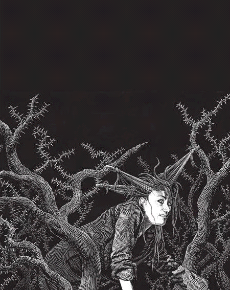 Пейзаж открывался мрачный и голый, покрытый лишь кустарниками и ежевикой, и ведьма привела нас в самые спутанные заросли. Она потащила Алису к колючему кустарнику и привязала за волосы к переплетенным ветвям. Пока я с ужасом наблюдал с плеча Шона за происходящим, Скарабек обошла терновник три раза, против часовой стрелки, повторяя темные заклинания. Алиса начала плакать. Она прекрасно понимала, что делает ведьма.