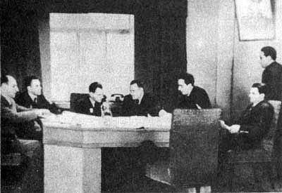 И.Е. Черток докладывает на одном из первых заседаний Совета главных. Слева направо: Б.Е. Черток, В.П. Бармин, М.С. Рязанский, С.П. Королев, В.И. Кузнецов, В.П. Глушко, Я.А. Пилюгин