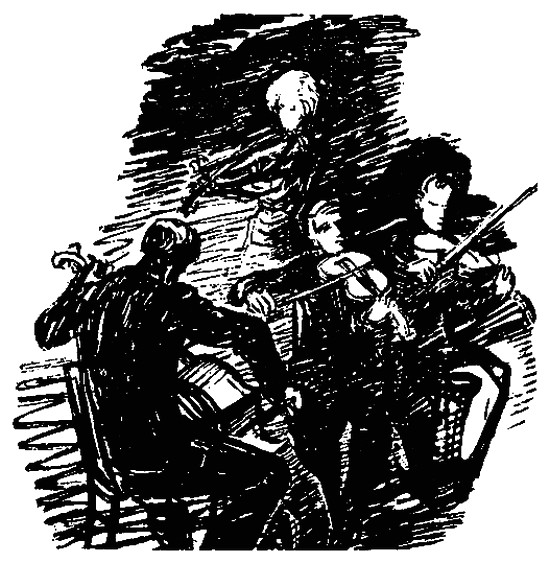 Писарь Бертин, наконец-то на исходе 1917 года сбросивший с глаз пелену, лежит без сна и тихо насвистывает тему, рожденную бессмертной душой Франца Шуберта, — тему струнного квартета; четыре полых деревянных коробки с натянутыми на них струнами из жил животных и наканифоленный пучок лошадиных волос, превращенный человеческим даром изобретательства в перевернутую дугу, подняли ее на почти неправдоподобную высоту прекрасного, облагороженного звучания. Что в том, что умение музыкантов не соответствовало трудности этого произведения? Все они чувствовали, какое чудо звукописи, какое высокое произведение искусства создал Франц Шуберт. Правда, после месяца работы они сложили оружие, так и не овладев квартетом. «Мы, пожалуй, слишком понадеялись на себя», — сказал в конце концов Генгнагель, виолончелист, самый зрелый музыкант из всей четверки. Но никогда уж не закроются эти ворота, ведущие к последнему кругу подземного царства, к самим праматерям, к первоистокам музыки…