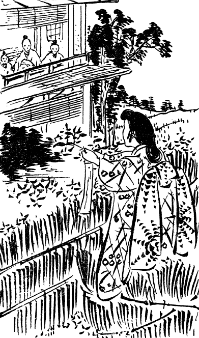 Поступило незатейливое указание по поводу завтрака, и вся компания обосновалась на заслуженный отдых. Хёсукэ отправился в город, чтобы подсобрать слухов. Сукэсигэ обратился к свитку, подобранному в тодане (шкафу) его апартаментов. Сёдзи присел неподалеку на корточки и превратился в благодарного слушателя своего господина, читавшего текст нараспев. Время от времени Сукэсигэ бросал тревожный взгляд на сад, наполненный ароматом цветущей сливы. От соседней бэссо их отделяли заросли хаги (леспедецы). Пока он туда смотрел, с обратной стороны изгороди появилась девушка. Она взглянула в сторону его апартаментов. Даже на таком большом расстоянии Сукэсигэ не составило труда рассмотреть редкую красоту этой девушки. Его озадачило что-то до боли знакомое в ее походке и фигуре. Приблизившись к загородке, она повесила на нее танзаку (свиток бумаги для стихов). Потом еще раз взглянула на него и в спешке, напоминающей полет птицы, скрылась в направлении своего дома. Сукэсигэ попросил: «Сёдзи, пожалуйста, принеси мне танзаку, которую та девушка только что повесила на изгородь из хаги. Просто из праздного любопытства мне очень захотелось узнать его содержание». Сёдзи ответил: «Ваша светлость, ваше распоряжение я услышал, уяснил и спешу выполнить». Он ушел и быстро вернулся со свитком. Сукэсигэ развернул его и увидел тонкую работу кисточкой, приведшую его в восторг, от которого он даже не сдержал возгласа восхищения. «Вот уж на самом деле рука художника! Теперь ознакомимся с содержанием, которое тоже должно быть красивым». Письмена на бумаге складывались так: