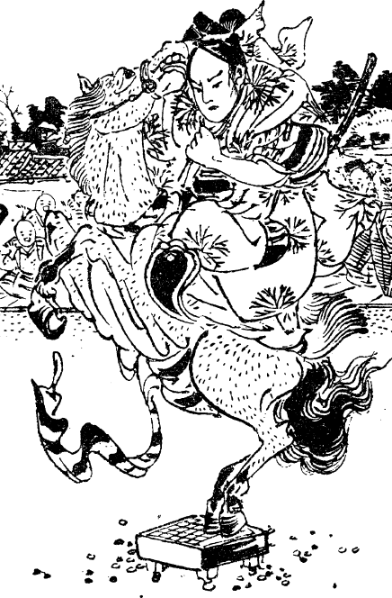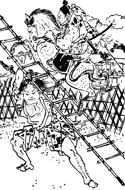 Сёгэн ничуть не сомневался в том, что все кончилось. Сукэсигэ должен был погибнуть, а его рото разбежаться кто куда. Тут перед ним появился Ясуцугу, его волосы торчали во все стороны от ярости или страха. «Отец родной, это не человек, а настоящий дьявол. Вон он скачет сюда на Оникагэ. Что будем делать?» Сёгэн вышел наружу. Сукэсигэ и его рото как раз входили во двор усадьбы. Оникагэ трусил, как дамская лошадка. Он вел себя покладистее любой кошки. Даже чуть ли не мурлыкал. Сёгэн буквально расплылся в улыбке. «Владыка Огури не посрамил своей репутации. Позвольте взглянуть. Все необходимые приготовления закончены, двор в порядке. Не соизволит ли ваша светлость воспользоваться лестницей?» Сукэсигэ ответил: «Как прикажет ваша честь. Распорядитесь, чтобы принесли лестницу и сделали соответствующие приготовления». Спешиваясь, он поручил Оникагэ заботе Казамы Хатиро. Входя в бэссо, он подождал Гото Хёсукэ. Тот в скором времени вошел на постоялый двор и тут же вышел. Потом появился Сукэсигэ. в эбоси, голубом ситатарэ (плащ) с золоченым мечом на перевязи. На кафтане сиял выпуклый белый герб в виде кикё. Казама подвел оседланного и взнузданного Оникагэ. Подхватив сине-красные поводья, Сукэсигэ вскочил в седло. Легонько он послал животное сделать круг по двору, поставил его на дыбы и пустил вскачь. Тем временем принесли лестницу длиной около 30 тутов (9 метров). Икэно Сёдзи занял свое место посередине двора. Ёкояма и его слуги с сомнением смотрели на обоих: сможет ли господин или самурай совершить такой неслыханный подвиг. Сукэсигэ подскакал к Сёдзи. «Все готово?» – «Ничего не бойтесь, мой господин. Лестница сама по себе как хорошо набитая дорога. Скачите вверх и ни в чем не сомневайтесь». Несколько раз Сукэсигэ загонял Оникагэ вверх по лестнице. Сёдзи держал ее надежно как скала. Оникагэ смотрительно ставил сначала одну ногу вперед, потом другую, а потом проделывал все в обратном порядке. Сукэсигэ помогал своему коню голосом и поводьями. В конечном счете благородный зверь выполнил поставленную перед ним задачу. Аккуратно поставив на место передние и задние ноги, он поднялся по ступенькам. Сёдзи аккуратно наклонил лошадь с седоком. Теперь они находились посередине. Как они будут спускаться? Лестницу он держал в руке, как простую алебарду. Сёдзи аккуратно опустил противоположный конец лестницы на землю. С осторожностью Сукэсигэ начал побуждать Оникагэ к совершению спуска. Как только лошадь и человек ступили на твердую землю, они помчались галопом по кругу, поднимая пыль и гальку в воздух, как будто налетел настоящий ураган. Толпа взорвалась бурными аплодисментами. Даже Сёгэн, сердце которого колотилось от паники и смертельного страха, не смог удержаться от выражения восхищения произошедшим. Никто не мог сравниться с господином и мужчиной. Сукэсигэ остановил лошадь перед Сёдзи. Другой похвалы он не мог выразить даже своему самураю. В молчаливом приветствии все рото отвесили глубокий поклон этой сильной личности. Сукэсигэ проскакал перед Сёгэном, стоящим на рока. «Мы выполнили распоряжение Сёгэна-доно. Эта демонстрация представляет собой просто шутку. Что еще ваш Сукэсигэ может сделать по вашей благородной воле?» Сёгэн заговорил угрюмо так, будто хотел уличить его в некоем промахе: «Пусть принесут го-бан. Хочу, чтобы ты встал на доску для игры в 