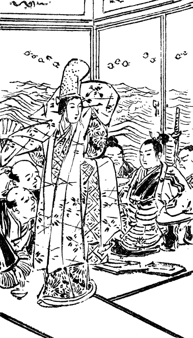 Когда они вошли в залу, пир был в самом разгаре. Понятно, что сакэ шло по кругу без остановки и уже мало кто заботился о бдительности. Братья Томимаруя простерлись перед Сёгэном и Сукэсигэ, сидящими на почетных местах во главе компании. «Просим принять вот это сакэ, то есть авамори из Акунэ. [43] Такой напиток достоин величайших из гостей. Пусть даже если не очень-то понравится, все-таки снизойдите до того, чтобы испить этого вина». Налив сакэ в чашку, Китидзи уверенно поднес ее к губам и выпил первым, как бы подтверждая его высокое качество. Потом этого вина налили Сукэсигэ и Сёгэну. Как только Сукэсигэ взял чашку в руку, вперед вышла Каору. «Покорнейше прошу, милостивый государь, отставить это вино в сторону. Сначала полюбуйтесь танцем, а потом наступит очередь вашего вина. Удостойте благожелательным вниманием мидзу-но куруму (водную телегу)». Она открыла свой веер и приняла позу для танца. Сукэсигэ опустил свою чашку. Сёгэн нахмурился и, воспользовавшись моментом, пока внимание всех переключилось на Каору, вылил содержимое своей чашки на пол рядом с собой. Танцевала Каору просто божественно. Потом она запела:
