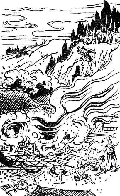 Как только он это сделал, до его чутких ноздрей долетел запах дыма, а зоркие глаза заметили отблески пламени. Взглянув вверх, он тут же осознал, что случилось. Пока он общался с Китидзи, принесенное им пламя вырвалось из плена. Пламя охватило весь коя. Как вспышки молнии пламя вырывалось из-под соломенного конька просторного строения. Сквозь горящую крышу пробивались вверх густые клубы дыма. Яркий всполох света ударил в самое небо. На его плечо легла чья-то рука. Над ухом прозвучал несколько раздраженный голос Хёсукэ: «Разве Сёдзи-доно не мог подождать условного сигнала?» – «Искренне приношу свои извинения за такой результат, – отвечал Сёдзи, – но вмешался вот этот приятель, и за разговором с ним я упустил контроль над пламенем. Прошу принять мои оправдания, милостивый государь». – «Что сделано, то сделано», – успокоил его Хёсукэ. Они с рото осмотрели тело содержателя постоялого двора. «Сёдзи-доно обошелся без меча. Достойный способ уничтожения такого негодяя. У нас напряженная работа, и особого выбора она не предусматривает. Никто не избежал смерти. Но что делать? Ее светлости нигде отыскать не получилось. Местное население проснулось, и квартал кишит народом. Смотри! На ясики Ёкоямы подняли тревогу». Так оно и было. Теперь громко звонили в храмовые и пожарные колокола. Пламя объяло Томимарую и вырывалось языками через крыши соседних строений. Кэраи и слуги Ёкоямы в замешательстве сбегались, чтобы отстоять свое бэссо. Отойдя на склон горы, рото Огури наблюдали за плодами дел своих. Переменчивый ветер, дувший в лабиринте сходящихся долин, гнал языки пламени и дым сначала в одну сторону, а потом в противоположную. С удовлетворением они отметили безнадежность попытки прекратить распространение пожара и спасти бэссо. Потом решив, что им остается только сожалеть о неполном выполнении своей задачи и необходимости доложить своему господину об этом, прихватив голову Ёкоямы Сабуро, они поки нули Камакуру. На этот раз чтобы со всех ног поспешить в Яхаги на территории провинции Микава.
