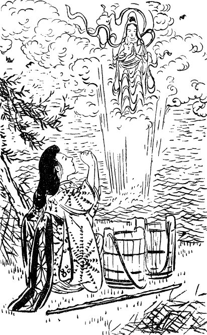 В полном отчаянии Тэрутэ поднялась и встала рядом с прудом. Место здесь было чудесное. Окруженные низкими холмами, поросшими кедром, открывались лужайки по берегам пруда, в это время года убранные цветами лета. На склоне холма отдельно стоял небольшой алтарь. Определенную причудливость ему придавали тории, два каменных торо (фонари), а также каменные ступени. В изумлении девушка огляделась. «Ах! Вот уж правда, что существование Тэрутэ определяется несчастьем. Вокруг одно зло. Все ополчились против меня. Доброго отношения нигде не сыскать. Порученную работу выполнить нет никакой возможности, а этот злой человек тем самым старается заманить меня в ловушку. Однако Кохаги обязательно покинет мою нынешнюю жизнь. Каннон Сама! Каннон Сама!» Она крепко обмотала свой тасуки (узкий шнур, которым подвязывали рукава кимоно) вокруг запястья, затянув узел зубами. Подняв молитвенно руки, она приготовилась броситься в воду. Тут в центре пруда появилось свечение. Оно становилось все ярче, пока сияние не заполнило всю округу.