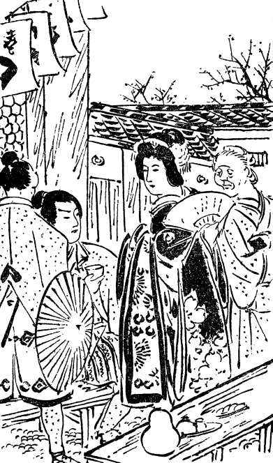 Пока Сукэсигэ шел в ванную комнату, его осенило по поводу основного рода деятельности пригласившего его человека. То есть он понял, что просторный постоялый двор Мантё представлял собой не просто дом для приема путников с бесплатным и добротным обслуживанием, характерным для городов того времени с почтовыми станциями. Как же могла Тэрутэ попасть в такое место? И как ее теперь вызволить из него? Мысль эта полностью владела им на протяжении устроенного после бани пира. Угощения подали самые изысканные: рыба всевозможного вида, омары из далеких морей, сохраненные живыми в соленой воде, сакэ, своим ароматом призывавшее к безмерному употреблению. Все желание Сукэсигэ отправиться в путь улетучилось. Он выглядел тактичным, но совсем беспечным постояльцем, зато все его мысли оста вались занятыми приближающейся беседой с женой. Он попросил Мантё, очень на то рассчитывавшего, продлить свое пребывание у него в гостях до утра. Теперь он решил воспользоваться благоприятным поворотом судьбы и выпавшим на его долю счастливым случаем. После угощения его проводили в садовую постройку, судя по висящей внутри ее табличке названную хагинома. Пока он полулежа задавал вопросы Ханако, а также отвечал на ее вопросы, обитателей дома потревожил какой-то необычный шум. Послышались испуганные голоса. Подумав, что его недавние враги могли за ним проследить, а также узнать место, где он остановился, Сукэсигэ поднялся и пошел на шум. Однако никаких самураев нигде не нашлось: просто разбушевался его верный Оникагэ. Как уже говорилось, конь проникся чистой симпатией к девушке, оказавшейся в недостойном ее положении. Животному не дано осознать необходимость использования чужого имени и сокрытия своего собственного, а также способности трезво оценить судьбу Тэрутэ и найти путь ее освобождения из нынешнего заточения. Сначала договорившись обо всем с хозяином, приютившим их, Сукэсигэ попросился на отдых. Этот отдых ему тут же представили. На эту ночь Мантё вынашивал свои планы, неизвестные Сукэсигэ; Ханако также строила особенные планы на нее, которыми не стала делиться с Сукэсигэ и своим отцом; О’Наги настолько запуталась в событиях, что ей требовалось время во всем разобраться: то ли избавиться от беспокойного гостя как можно быстрее, то ли прислушаться к намеку, брошенному ей со стороны Ханако и уже наполовину одобренному.