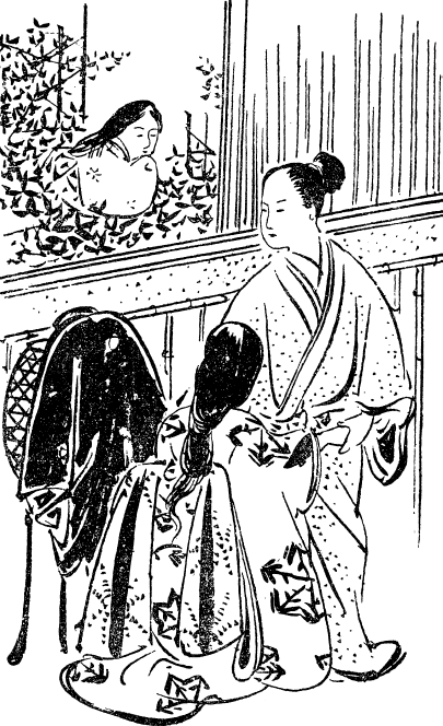 Настороженный Сукэсигэ услышал тихие шаги женщины, идущей по коридору. То могла быть только Тэрутэ. Подобрав свой хаори, он бросил его в андон, и его комната озарилась тусклым светом. Неслышным движением раздвинул сёдзи. Шаги стихли. Однако теперь они послышались со стороны сада. Сукэсигэ сдвинул панель амадо. В комнату пролился свет луны. Тут же из мрака коридора показалась фигура женщины. Взяв ее за руку, Сукэсигэ потянул женщину внутрь комнаты, а потом осторожно снял дзукин, скрывавший потупленный взор и бледное лицо Ханако. Он настолько разволновался, что стоял без движения, сжимая ее руку. Оба они не обратили внимания на тихий мучительный вздох, прозвучавший из тени сада. Сукэсигэ медленно сдвинул сёдзи вместе. «Дочь Мантё-доно! А где же Тэрутэ? Понятно, что ей здесь не место. Прошу вас, дева, уйти. Ваши родители очень расстроятся, если узнают о таком вашем поступке. Сотан не может принять такого подарка судьбы». Ханако промолвила: «Нет, сэнсэй, примите благодарность и почтительные извинения Ханако за вторжение в ваше жилище. Она зашла слишком далеко, чтобы пойти на попятную. Мантё самым искренним образом мечтает о сыне, достойном стать мужем его дочери. Прошу вас остаться в Аохаке и принять услуги моей скромной персоны; услуги, радостно предоставляемые тому, кто спас Ханако от беды». Заплакав, она опустилась на пол у его ног. Озадаченный и раздосадованный Сукэсигэ растерялся и не знал, что ему предпринять. А если вдруг придет Тэрутэ?!