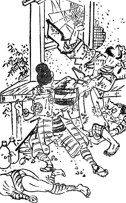 Оба обрадовались такому доброму предзнаменованию. На веранде алтаря установили ои. Достали и приготовили еду. Потом Косиро с трудом отодвинул кицунэ-госи (решетчатую крышку люка). Ближе к завершению своего путешествия Тэрутэ переоделась в достойное ее платье. Из подручных материалов соорудили подобие лежанки, потушили костер и закрыли решетку люка. Наши путники улеглись отдохнуть. Среди ночи Косиро разбудил Тэрутэ. Прижав палец к губам, он обратил ее внимание на происходящее снаружи. По горной тропе, пролегавшей совсем рядом, приближались яркие огни. Если это окажутся тори-хата (стражи порядка) Асикаги, Косиро и Тэрутэ оставалось разве что покончить с собой. Дама и ее слуга проявляли единодушие. Они приготовились вместе отправиться в Мэйдо. Группа людей находилась уже совсем близко, а наши путники сидели запертыми в алтаре. Убежать не представлялось возможным. Они внимательно следили за происходящим снаружи через решетку. В скором времени появились незваные гости. На вид это были участники банды горных разбойников, и до этого кто-то крепко их потрепал. Свидетельством этого служили окровавленные повязки на головах, ногах и руках, стоны, а также разбуженная искренняя ярость разбойников. Их вожак выглядел энергичным малым, смуглым и волосатым, но назвать его юным язык не поворачивался. «Дело дрянь! – прорычал он. Потом взглянул на свою перевязанную кое-как руку, рассмеялся и продолжил: – На самом деле этот молодой самурай у Сэйриндзи умеет крепко ударить. Киити-сан, он своей дубиной проломил тебе голову. Тебе следовало бы отказаться от титула Эмма или поискать помощи у тезки. Дзиро, тактичный Дзиро-но Такэ, повел себя ненамного достойнее. Под глазами у него залегли синяки, нос увеличился в два раза, а зубы заметно поредели. Эти рото проявили себя такими же стойкими воинами, как их господин». – «Ой! У меня болит рука». – «Идза! Мне, похоже, сломали ребра. Меня лягнула лошадь». – «Ай! Вашему Тодзакаи в кашу разбили обе голени». Жалобные восклицания звучали одно за другим без перерыва. По указанию вожака стали готовить гипсы и бинты. Косиро несколько раз наполовину вытаскивал свой меч из ножен, когда кто-нибудь из разбойников приближался к алтарю. Они совершенно очевидно давно облюбовали это убежище, расположенное поблизости. Они забирались под него, потом вылезали с огромным железным котлом и кухонной утварью самого разного предназначения. Через какое-то время еду и лекарства приготовили, приступили к лечению.