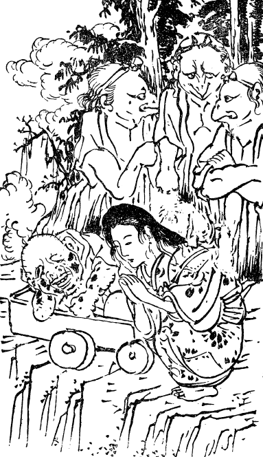 Все силы покинули ее. На протяжении нескольких часов она не пробовала еды; некому было передать ее бремя. Мучительно она тащила свою тележку, преодолевала затяжные крутые склоны гор, продиралась сквозь нескончаемый лес. Какое-то время она глядела вниз на широкие рисовые поля, на которых в скором будущем должен появиться бархат яркой зелени, обещающей пропитание сотням монахов монастырской деревни. Чтобы помочь ей, никто и пальцем не пошевелил. Непристойные ухмылки, отсутствие внимания, даже грубость, когда ее просто сталкивали в сторону, как препятствие на пути, и заставляли выполнять двойную работу, чтобы снова вытащить тележку на дорогу, а также открытое недовольство по поводу ее неприглядного внешнего вида. Наступили сумерки, а она еще не прошла и трети пути. Великое отчаяние охватило ее душу; точно так же она почувствовала себя, когда впервые вступила на эту святую землю. Праведный гнев овладел ею, напугал и лишил сил. Весь день Тэрутэ с Сукэсигэ обходились совсем без еды. Весь день она преодолевала препятствия, те, которые не только видела и ощущала, но и те, которые увидеть было нельзя. Паника охватила Тэрутэ-химэ. Она взглянула на глубокую пропасть, по краю которой двигалась тележка, едва видимую внизу долину. Ах! Там протекала Сандзуногава, река, через которую путник должен был переправиться по пути в круги ада наказаний. Сомнений не оставалось: боги отвернулись от нее с ее мужем. Безумное желание броситься в пропасть и покончить с мучениями возникло как раз из их недовольства ею. В полном отчаянии Тэрутэ огляделась. Людей она не увидела, так как все передвижения по этой тропе уже прекратились. Она потянула тележку со всей остававшейся у нее силой. Шаг за шагом она поднимала свою поклажу по крутому склону горы. Но настал момент, когда силы женщины полностью иссякли. Тележка покатилась назад и остановилась, свесившись на краю обрыва. Надо было спасти мужа. Ох уж эти злые боги! Опять она попыталась, и опять у нее ничего не получилось. Чаша ее терпения перелилась через край. Каннон Сама! Каннон Сама! Задание ей досталось не по силам. Заповеди богини больше не было возможности следовать. Дело касалось не препятствий на пути всех усилий, а открытого проявления праведного гнева. С перекошенным лицом и широко открытыми глазами Тэрутэ подошла к своему мужу. Вместе они должны пройти весь путь, вместе предстать перед Эмма-О. Двигать ими должна не надежда на излечение, а стремление ублажить недовольных ими богов. Уверенным шагом она подошла к тележке и взялась за перекладину курумы. Толчок с прыжком, и все закончится на камнях, торчащих на дне пропасти.