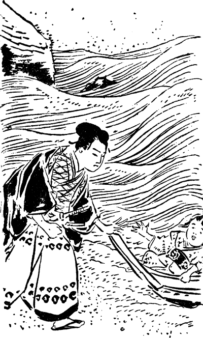 Дошла ли ее молитва до цели или нет, она не могла знать, как не могла себе представить того, что спасение находилось гораздо ближе, чем ей казалось. Случилось так, что Сукэсигэ в этот день решил побродить по горам этого острова. Приближающийся шторм заставил его искать убежище, которое он нашел в пещере богини Бэнтэн, где смог спрятаться от дождя. Стоял у входа в нее и рассматривал пенистые волны бурного моря. Внезапно в поле его зрения попала лодка, скачущая на гребне волны и направляющаяся прямо на отвесные скалы с гибельными рифами у подножия, окаймляющие остров со стороны моря. К тому же было видно, что пассажир лодки находится в безвыходном положении, так как совершенно не владеет навыками управления лодкой, ведь его суденышко двигалось по воле волн, а находящийся в нем человек не пытался придать ему иное направление или уйти в спокойные воды, если такое вообще представлялось возможным. Сукэсигэ присмотрелся к лодке пристальнее. В ней находились женщина или ребенок. Его взгляд упал на безмятежную воду в его пещере, а также в канале, ведущем в море.