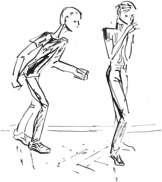 Шаг влево – короткое забегание. А что? Я ведь веду! Лариска дёргает меня на то место, где мы должны были быть по танцу. Шаг через первую позицию – это мягкий удар носком. Мяча нет, но он всегда передо мной. Стоит мне только захотеть. Вместо деми плие делаю подкат. Не задеть при этом ногу Лариски – это искусство. Она так и подставляет то одну, то другую. Но я не должен потерять мяч.