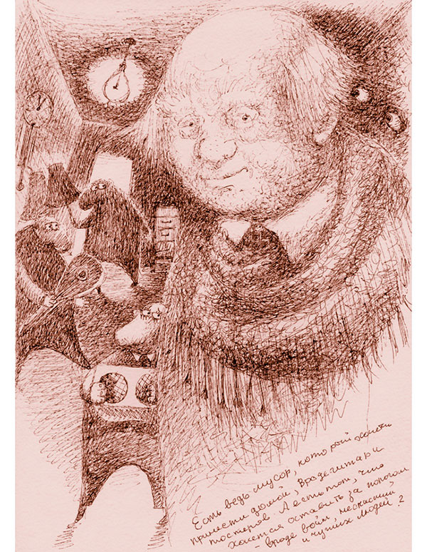 Раньше время скрывалось где-то от Мусорщика – может быть, его проглотил мусор. Или свалка. Или просто он старался не замечать его. Потому что если замечать время, то оно становится как мусор и ты думаешь о нем, точь-в-точь как о мусоре: сколько его осталось, да сколько его было, да зачем его много, да зачем его мало, да что делать, когда его много или мало.