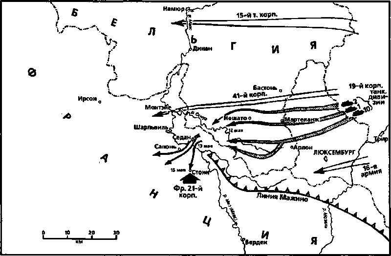 Растянувшись в колонну длиной миль в сто, 15-й, 41-й и 19-й корпуса вышли из своих лесных укрытий и пересекли границу, сметая заставы противника, оказавшего слабое, спонтанное сопротивление. В некоторых местах обороняющиеся были застигнуты в буквальном смысле спящими. Диверсанты в гражданской одежде заблаговременно проникли в эту зону под видом туристов и смогли разминировать многие мосты и проходы, обеспечив продвижение по ним немецкой военной техники. В состав передовых штурмовых групп, помимо танков и пехоты, входили саперы, задачей которых являлось уничтожение заграждений на дорогах. Наступление везде развивалось успешно и по графику. Гальдер назвал его «очень хорошим маршевым достижением». И действительно, непрерывность передвижения обеспечивалась, в основном, благодаря напряженному труду саперов и дорожной службы, устранявших препятствия и дорожные пробки, возникавшие в самые неожиданные моменты и неизбежно затруднявшие продвижение частей Гудериана. Появление кавалерийской дивизии на подступах к реке Семуа, переброшенной частично на грузовиках, частично на танках, вызвало лишь краткую заминку в немецком наступлении, ибо дивизия после короткой стычки была разгромлена. Немецкие танки проникали в оборону французов как нож в масло. Паника, которую они сеяли, многократно преувеличивалась слухами, распространявшимися солдатами, отставшими от своих частей или уцелевшими после боя. Эти слухи подрывали боевой дух частей, еще не принимавших участие в боевых действиях. И все же Клейст, как кавалерист, отдал должное отваге французских конников, заставивших 10-ю танковую дивизию отклониться к левому флангу Гудериана, южнее своей полосы наступления, чтобы противостоять угрозе со стороны французской кавалерии у Лонгви, скорее всего, мифической.
