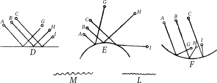 Кстати, эти лучи, когда они проходят только через одно прозрачное однородное тело, должны представляться в виде прямых линий; однако, если лучи наталкиваются на другие тела, они отклоняются или задерживаются таким же образом, как видоизменяется движение мяча либо камня, брошенных в воздух, из-за препятствий, встречаемых ими; поэтому легко поверить, что действие или стремление к движению, о которых я сказал, что их следует принимать за свет, должны следовать тем же законам, что и движение. Чтобы полностью объяснить это третье сравнение, необходимо обратить внимание на то, что тела, встречаемые мячом, пролетающим в воздухе, бывают мягкими, твердыми или жидкими; если тела мягкие, они останавливают и совершенно затормаживают движение мяча, например, когда он ударяется о материю, песок, грязь; если тела твердые, они сразу отбрасывают его в другую сторону, причем несколькими разными способами, что зависит от их поверхности: последняя бывает либо ровной и гладкой, либо шероховатой и неровной; с другой стороны, будучи гладкой, она может оказаться или плоской, или кривой; если она шероховатая, то ее неровность может заключаться в том, что либо она состоит из нескольких частей различной кривизны, каждая из которых достаточно гладкая, либо из ряда углов или острых выступов, либо из частей неодинаковой твердости, находящихся в движении; словом, мяч отбрасывается тысячью всевозможных способов. Надо заметить, что мяч, кроме своего движения, простого и обычного, переносящего его из одного места в другое, может иметь еще второе движение, которое заставляет его вращаться вокруг собственного центра, и что скорость этого вращения может иметь разные величины по отношению к первому движению. Когда несколько мячей, летящих в одном направлении, встречают тело, имеющее ровную и гладкую поверхность, они отклоняются от него одинаково; следовательно, если вся поверхность плоская, то мячи после удара сохраняют между собой то же расстояние, что и до удара; если ее кривизна направлена внутрь или наружу, они приближаются или удаляются в определенном порядке по отношению друг к другу, в большей или меньшей зависимости от этой кривизны. Как видите, здесь мячи А, В, С (рис. 40) при столкновении с поверхностью тел D, Е, F отклоняются к точкам G, Н, I. Если мячи встречают неровную поверхность, например L или М, они отскакивают в разные стороны, причем каждый в зависимости от того участка поверхности, от которого он отбрасывается; в случае, когда неровность ее состоит лишь в том, что ее участки имеют разную кривизну, мячи не меняют ничего другого в своем движении, кроме направления. Однако неровность поверхности бывает и другого рода: в этом случае она приводит к тому, что мячи, имевшие ранее простое прямолинейное движение, теряют часть его и приобретают вместо него вращательное, которое сравнительно с прямолинейным имеет разные значения и находится в зависимости от расположения встречаемых ими тел; те, кто играет в лапту, ощущают моменты, когда их мяч ударяется о неправильно вставленный кафель или когда они его касаются, наклоняя лапту (это называется, насколько я знаю, «срезать» или «закручивать»). Наконец, заметьте, если мяч во время движения встречает под косым углом поверхность жидкого тела, через которое он может пройти более или менее легко по сравнению со средой, откуд