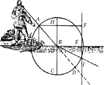 Здесь же достаточно будет предупредить, что лучи, падающие на цветные и неполированные тела, отражаются обычно во все стороны, даже если они устремляются в одном направлении. Лучи, падающие на поверхность белого тела AB (рис. 42), исходящие только из источника С, отражаются во всех без исключения направлениях; поэтому в каком бы месте ни расположить глаз (например, в точке D), всегда окажется несколько лучей, идущих из каждого участка поверхности АВ, которые стремятся к нему. Если предположить, что это тело очень пористо, как бумага или материя, так что свет проходит насквозь и он виден, даже если глаз находится по другую сторону от источника света (например, в точке Е), то тем не менее в нем всегда отразятся несколько лучей, исходящих из каждой части этого тела. Наконец, заметим, что лучи отклоняются так же, как мяч, когда они встречают под косым углом поверхность прозрачного тела, в которую они проникают более или менее легко по сравнению с той средой, откуда они исходят; этот род отклонения называется рефракцией. <…>