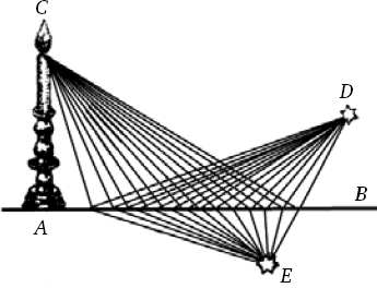 Таким образом, все части разреженной материи, которые освещены стороной Солнца, обращенной к ним, стремятся по прямой линии к нашим глазам в то мгновение, когда они открыты, не мешая друг другу и не удерживаясь даже грубыми частицами прозрачных тел, расположенными между Солнцем и глазами, либо потому, что эти тела перемещаются различными способами, как воздух, почти всегда пребывающий в состоянии движения, либо потому, что они находятся в состоянии покоя, как может находиться стекло или хрусталь. Обратите внимание на то, что следует отличать движение или действие от стремления к движению, ибо можно вполне представить себе, что части вина, которые располагаются около С, одновременно стремятся к В и А, вопреки тому, что они не могут в одно и то же время двигаться по этим двум направлениям, и что они стремятся точно по прямой линии к В и А, несмотря на то, что они не могут перемещаться столь точно к А по прямой линии из-за гроздей, находящихся между ними. Следовательно, ввиду того, что это не столько движение, сколько действие светящихся точек, которое надлежит воспринимать как свет, излучаемый ими, вы должны прийти к выводу, что лучи света суть не что иное, как линии, вдоль которых стремится это действие. Таким образом, существует бесконечное число лучей, идущих от всех точек светящихся тел ко всем точкам, освещаемым ими, точно так же, как имеется беспредельное количество прямых линий, вдоль которых действие, распространяющееся от поверхности вина CDE, стремится к А; существует безмерное множество и других линий, вдоль которых действие, идущее от тех же точек, стремится к В, причем эти действия, или стремления, не мешают друг другу.