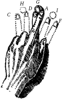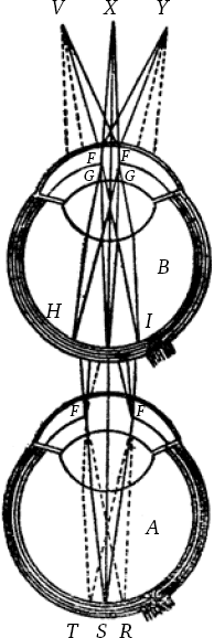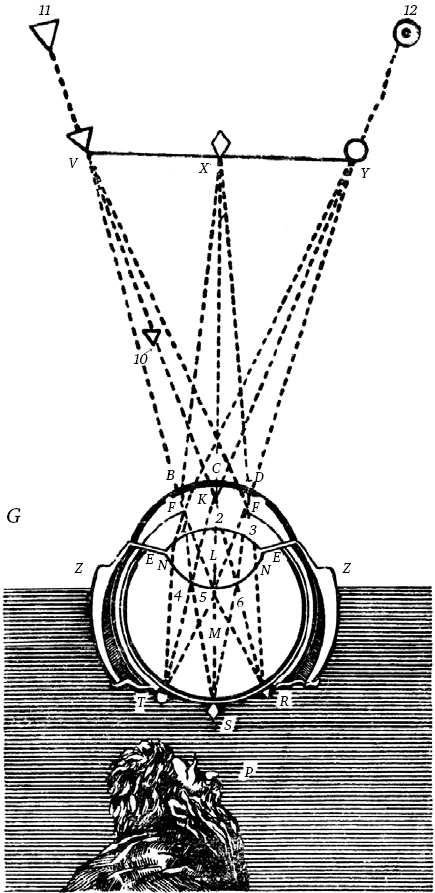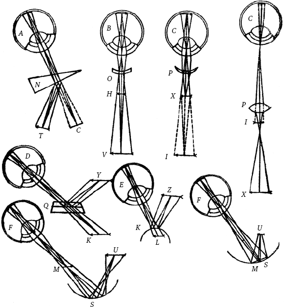 Чтобы не было никаких сомнений в том, что зрение совершается так, как я объяснил, вы должны, кроме того, рассмотреть причины, из-за которых иногда случается, что зрение нас обманывает; это происходит, во-первых, потому, что созерцает душа, а не глаз, и во-вторых, вследствие того, что она наблюдает только посредством мозга; отсюда вытекает, что слабоумные и спящие часто видят (или думают, что видят) разные предметы, которые не находятся перед их глазами: какие-то испарения, воздействуя на мозг, раздражают его части, обычно служащие для зрения, точно так же, как это делали бы предметы, если бы они существовали. Далее, ощущения, приходящие извне, проникают посредством нервов; следовательно, если нервы подвергаются некоторому возбуждению под действием необычной причины, то предметы можно видеть не в тех местах, где они находятся. Например, когда глаз rst (рис. 46), направленный на точку X, под воздействием пальца поворачивается к точке М, тогда части мозга, откуда идут нервы, располагаются не совсем так, как если бы мускулы глаза повернули его к точке М; в то же время они размещаются иначе, чем если бы глаз смотрел непосредственно в точку X; в результате глаз занимает среднее положение между двумя указанными состояниями, и все обстоит таким образом, как если бы он был устремлен на точку Y; следовательно, предмет М будет казаться расположенным на месте Y, Y – на месте Х и X – на месте V; эти предметы, рассматриваемые другим глазом RST, представляются находящимися на своих подлинных местах. В итоге они покажутся двойными. Подобным образом, если касаться маленького шарика G (рис. 48) двумя скрещенными пальцами А и D, то получается впечатление двух шариков, потому что, пока пальцы находятся в скрещенном положении, мускулы каждого из них стремятся их раздвинуть – А к С и D к F, вследствие чего части мозга, где начинаются нервы, прикрепленные к мускулам, располагаются так, как необходимо для того, чтобы показалось, что А находится в В, а D в Е; поэтому и появляется ощущение двух различных шариков H и I. Кроме того, издавна привыкли думать, что зрительные ощущения приходят из тех мест, по направлению к которым мы должны смотреть, чтобы их увидеть; если же случается, что они идут из других мест, мы можем легко быть введены в обман; все, кто болен желтухой или смотрит через желтое стекло, или закрыт в комнате, куда свет проходит только через желтые стекла, относят этот цвет за счет тел, на которые они смотрят. Тот, кто находится в темной комнате, недавно описанной мною, приписывает белому телу RST (рис. 47) цвета предметов VXY, так как он направляет свое зрение только на него. Глаза А, В, С, D, E, F (рис. 49), рассматривая предметы T, V, X, Y, Z, U через стекла N, О, Р и в зеркалах Q, R, S, относят их к точкам G, H, I, K, L, М; V и Z кажутся им меньше, а предметы X и U – больше, чем они есть на самом деле, или представляются меньшими и перевернутыми; последнее объясняется тем, что стекла и зеркала отклоняют лучи, идущие от предметов, таким образом, что глаза могут их видеть отчетливо только тогда, когда они располагаются для того, чтобы смотреть на точки G, Н, I, К, L, М, в чем легко убедятся те, кто потрудится изучить данный вопрос; при этом они поймут, насколько предки ошибались в своей катоптрике, когда пытались определять места изображений в вогнутых и выпуклых зеркалах. Надо также заметить, что все средства, которыми мы ра