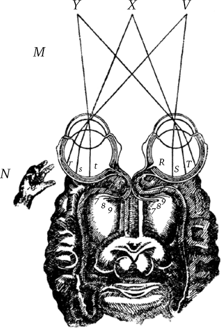 Что касается расположения каждой части предмета по отношению к нашему телу, то мы замечаем его посредством глаз так же, как при помощи рук; ознакомление с ним зависит не от изображения или воздействия, исходящих от предмета, а только от размещения маленьких частиц мозга, откуда нервы берут свое начало. Это размещение, отчасти меняющееся каждый раз, когда меняется положение членов, обслуживаемых нервами, организовано природой с целью не только указать душе, в каком месте находится та часть тела, которую она приводит в движение (по сравнению с другими), но также и для того, чтобы душа могла переносить оттуда свое внимание ко всем местам, расположенным на прямых линиях, проводимых из конца каждой части и продолженных до бесконечности. Совершенно так же обстоит со слепым, о котором мы так много говорили ранее: когда он поворачивает свою руку А (рис. 45) к точке E или руку С к Е, нервы, находящиеся в руке, производят некоторое изменение в его мозгу, дающее возможность душе слепого узнать не только место А или С, но и все другие, располагающиеся на прямой линий АЕ или CE, так что она может обратить свое внимание на предметы B и D и определить места, где они пребывают, хотя душа не знает и нисколько не думает о тех местах, где помещаются обе руки. Точно так же, когда глаз или голова поворачиваются в какую-нибудь сторону, наша душа предупреждается об этом изменением, которое нервы, находящиеся в мускулах, обслуживающих движения, вызывают в мозгу. Здесь, в глазу RST (рис. 46), изменение положения тонкого волокна оптического нерва, помещающегося в точке R, или S, или Т, вызывает изменение расположения частей мозга 7, 8 или 9, вследствие чего душа может знать все места, которые находятся на прямой RV или SX, или TY. Следовательно, вам не должно казаться странным, что предметы можно обозревать в их истинном положении, несмотря на то, что изображения, создаваемые ими в глазу, являются совершенно обратными. Наш слепой может одновременно чувствовать предмет В (рис. 45), лежащий справа, с помощью левой руки и D, находящийся слева, посредством правой. Однако слепой не делает вывода о том, что тело двойное, хотя он касается его двумя руками; подобным образом при помощи глаз, расположенных так, чтобы обратить наше внимание на одно и то же место, мы видим лишь один предмет, несмотря на то, что в каждом глазу получается свое изображение.