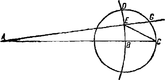 Пусть А (рис. 51) – местонахождение Солнца, BD – часть орбиты, или годичного пути Земли, ABC – прямая линия, которая, допустим, пересекает путь Луны, представленный кругом CD с центром в точке С. Но если свет требует, например, часа времени, чтобы пройти пространство между Землей и Луной, то отсюда следует, что после того, как Земля придет в точку В, даваемая ею тень, или перерыв в свете, еще не достигнет точки С, но придет туда часом позже. Это значит, что только через час после того, как Земля придет в точку В, Луна, пришедшая в точку С, начнет там затемняться; но нужен еще другой час, для того чтобы это затемнение, или перерыв в свете, достигло Земли. Предположим, что за эти два часа Земля пришла в Е. Земля, находясь в Е, увидит затемненную Луну в С, откуда она ушла за час перед этим, и в то же время увидит Солнце в А. В самом деле, ввиду того, что я вместе с Коперником предполагаю Солнце неподвижным, и ввиду того, что свет распространяется по прямым линиям, Солнце должно всегда казаться там, где оно есть. Но, говорят, наблюдения свидетельствуют, что затемненная Луна всегда наблюдается на эклиптике, в месте, противоположном Солнцу, между тем как здесь она должна казаться позади от этого места на угол GEC, дополняющий угол АЕС до двух прямых. Значит, это противоречит опыту, так как угол GEC был бы сильно заметен, равняясь приблизительно 33°. В самом деле, согласно нашим вычислениям, изложенным в трактате «О причинах явлений, видимых при наблюдениях Сатурна», расстояние BA между Землей и Солнцем приблизительно равно 12 000 земных диаметров и в 400 раз больше, чем ВС, – расстояние до Луны, равное 30 диаметрам. Значит, угол ЕСВ будет приблизительно в 400 раз больше, чем BAЕ, который равен 5 мин, т. е. пути, который проходит Земля по своей орбите в 2 часа; таким образом, угол ВCE равен почти 33°, так же как и CEG, который будет больше на 5 мин.