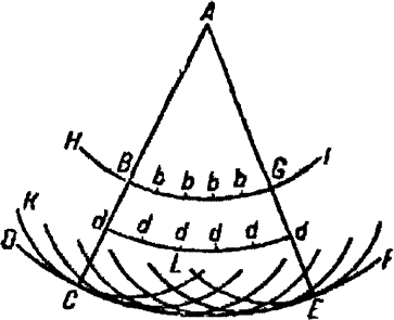 Отсюда ясна причина, почему свет, если только его лучи не отражены или не прерваны, распространяется исключительно по прямым, так что он освещает какой-либо предмет только тогда, когда от его источника до этого предмета открыт прямолинейный путь. Так, если, например, имеется отверстие BG, ограниченное непрозрачными телами ВН и GI, волна света из точки А всегда будет ограничиваться прямыми AC и АЕ: части отдельных волн, распространяющиеся за пределы пространства ACE, слишком слабы, чтобы производить там свет.