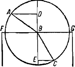 Мера этих углов будет найдена, если описать из точки В окружность, пересекающую лучи АВ и ВС. Действительно, перпендикуляры AD и CE, опущенные из точек пересечения на прямую DE и называемые синусами углов ABD и СВЕ, находятся в некотором отношении друг к другу, которое для определенного прозрачного тела при всяком наклоне падающего луча всегда остается одинаковым; для стекла это отношение очень близко к 3: 2, для воды оно очень близко к 4: 3, и таким образом, оно меняется для различных прозрачных тел.