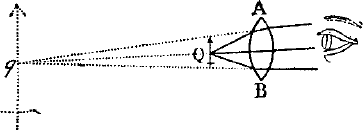 Точно так же объект Q (рис. 63), рассматриваемый через линзу АВ, кажется находящимся в месте q, откуда расходятся лучи, проходя от линзы к глазу. При этом нужно отметить, что изображение объекта в q тем больше или тем меньше самого объекта в Q, чем расстояние изображения в q от линзы АВ больше или меньше расстояния объекта в Q от той же линзы. Если объект рассматривается через две или большее число таких выпуклых или вогнутых стекол, то каждое стекло будет давать новое изображение, и объект будет казаться находящимся на месте последнего изображения, имея величину этого изображения. На этих соображениях развивается теория микроскопов и телескопов. Ибо эта теория состоит почти только в описании стекол, дающих последнее изображение объекта столь отчетливым, большим и светлым, как это требуется. Я дал в аксиомах и объяснениях к ним сводку того, что до сих пор трактовалось в оптике. Я ограничиваюсь тем, что общепринятое считаю принципами в отношении к тому, что предполагаю написать дальше. Изложенного достаточно в качестве введения читателям с быстрым умом и хорошим пониманием, но еще не опытным в оптике. Те, кто уже ознакомился с этой наукой и обращался со стеклами, легче поймут последующее.