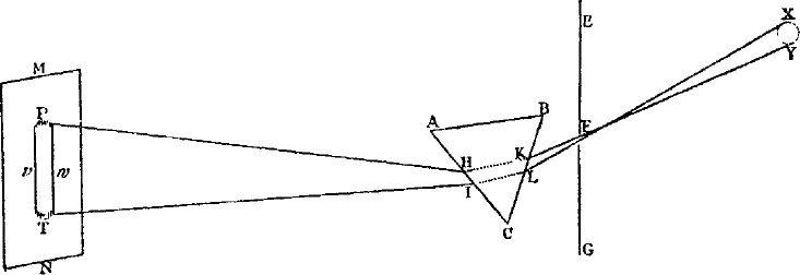 Или, если угодно, пусть ABC представляет самую призму, направленную прямо к глазу наблюдателя ее ближайшей вершиной, и пусть XY будет солнце, MN – бумага, на которую отбрасывается солнечное изображение спектра, РТ – само изображение, стороны которого v и w прямолинейны и параллельны, концы же Р и Т полукруглые. YKHP и XLIT – два луча; первый из них идет от нижней части солнца к верхней части изображения и преломляется в призме в К и Н; второй идет от верхней части солнца к нижней части изображения и преломляется у L и I. Преломления на обеих гранях призмы равны одно другому, т. е. преломление у К равно преломлению у I, и преломление у L равно преломлению у Н, так что преломления падающих лучей у К и L, взятые вместе, равны преломлениям выходящих лучей при К и Н, взятым вместе; складывая равное с равным, получаем, что преломления при К и Н, взятые вместе, равны преломлениям при I и L, взятым вместе, и, следовательно, два луча, одинаково преломленные, имеют тот же наклон один по отношению к другому после преломления, как и до него, т. е. наклон в половину градуса соответственно диаметру солнца, ибо так были наклонены лучи друг к другу до преломления. Таким образом, по правилам общепринятой оптики длина изображения РТ должна соответствовать углу в половину градуса у призмы и, следовательно, должна равняться ширине vw; поэтому изображение должно быть круглым. Так было бы, если бы два луча XLIT и YKHP и все остальные, дающие изображения Рw и Tv, одинаково преломлялись. Из опыта найдено, что изображение получается не круглое, но удлиненное, с длиною почти в пять раз большей ширины; поэтому лучи, идущие к верхнему концу Р изображения, претерпевают наибольшее преломление и должны больше преломляться, чем те лучи, которые идут к нижнему концу Т, если только неравенство преломления не случайно. Это изображение спектра РТ было окрашено красным в наименее преломленном конце Т, фиолетовым – в наиболее преломленном конце Р и желтым, зеленым и синим – в промежуточном пространстве. Это согласуется с первым положением, что свет, различающийся по цвету, различается и в отношении преломляемости. Длину изображения в предыдущих опытах я измерял от крайнего и наиболее слабого красного цвета на одном конце до наиболее слабого и крайнего синего на другом конце, исключая только небольшую полутень, ширина которой едва ли превосходила четверть дюйма, как было сказано выше. <…>