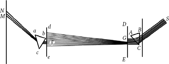 Пояснение. Пусть F (рис. 65) – широкое отверстие в ставне окна, через которое солнце освещает первую призму АВС, и пусть преломленный свет падает на середину доски DE, средняя же часть света – на отверстие G, сделанное в середине этой доски. Пусть эта пропущенная часть света снова падает на середину второй доски de и образует здесь такое же удлиненное изображение солнца, как было описано в третьем опыте. Вращая призму АВС медленно в ту и другую стороны вокруг ее оси, можно передвигать это изображение вверх и вниз по доске de; таким способом все его части от одного конца до другого можно заставить последовательно проходить через отверстие g, сделанное в середине этой доски. В то же время другая призма abc помещается вблизи за отверстием g для второго преломления пропущенного света. Установив таким образом предметы, я отмечал места М и N на противоположной стене, на которые падает преломленный свет, и нашел, что если обе доски и вторая призма остались неподвижными, то эти места постоянно изменялись при вращении первой призмы вокруг ее оси. Когда через отверстие g пропускалась нижняя часть света, падающего на вторую доску de, то свет приходил к нижнему положению М на стене; когда пропускалась верхняя часть света через то же отверстие g, то она доходила до более высокого места N на стене; при пропускании промежуточной части света через отверстие свет падал в некоторое место на стене между М и N. При неизменном положении отверстий в досках падение лучей на вторую призму оставалось тем же самым во всех случаях. И, однако, при таком одинаковом падении одни лучи преломлялись больше, другие меньше. Больше преломлялись во второй призме те лучи, которые больше всего отклонялись от своего пути при большем преломлении и в первой призме, и в силу этого постоянства большей преломляемости они по праву могут быть названы более преломляемыми.