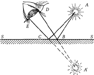 Вообразим себя в положении древнего оптика и рассмотрим задачу о получении изображения светящейся точки А от плоского зеркала SS (рис. 1). Древние знали прямолинейность распространения света и закон отражения. Если бы они приняли, как мы делаем это теперь, что свет исходит от точки А, то, пользуясь прямолинейностью и законом отражения света, они провели бы лучи ABD и ACE. Они нашли бы, что лучи упираются в глаз в точках D и Е. Но дальнейшая судьба лучей оставалась для них неизвестной, возникновение изображения в зеркале в точке А' было непонятным, тем более что, как видно из чертежа, лучи, подходя к глазу, расходятся, а не сходятся. На помощь в этой, казалось, непреодолимой для древнего трудности приходило представление о зрительных лучах, заимствованное из примитивных образов ребенка и дикаря. В самом деле, примем, что лучи, создающие изображение, идут не от источника к глазу, а наоборот, и что глаз каким-то образом чувствует первоначальное направление вышедших из него зрительных лучей. Эти лучи в рассматриваемом примере отражения от зеркала (см. рис. 1) отразятся, как и световые, у зеркала в точках С и В и соберутся в «источнике» в точке А. Первоначальное направление лучей, вышедших из глаз, «сигнализируется», по предположению древних, каким-то способом в мозг, и кажется, что встреча лучей произошла не после отражения, а в мнимой точке А', где пересекаются продолжения лучей, первоначально вышедших из глаза. Преимущество такого толкования заключается в том, что вовсе не требуется знание того, что происходит со светом внутри глаза. Достаточно лишь предположить, как это отмечено, что через глаз некоторым способом сигнализируется первоначальное направление зрительных лучей. Мнимое изображение создается в мозгу. Несмотря на всю причудливость воззрения о зрительных лучах, оно, несомненно, было полезным и прогрессивным для своего времени, так как позволяло построить правильную теорию получения изображений при помощи зеркал. Поэтому оно просуществовало очень долго. Еще в начале XVII века им иногда пользовался Галилей.