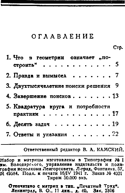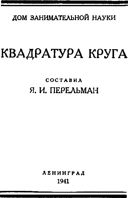 В нашей брошюре подробно рассматривается только третья, самая знаменитая из перечисленных задач — квадратура круга, вошедшая в поговорку. Читатель узнает, почему многовековые усилия решить эту задачу не приводили к успеху и почему нет никакой надежды разрешить ее когда-нибудь в будущем: квадратура круга (как и остальные две задачи нашего перечня) принадлежит к числу неразрешимых задач.