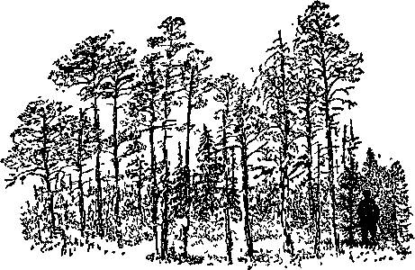хвойные шапки сосен-великанов. С юга тянется заросшая частым осинником просека. Ведет