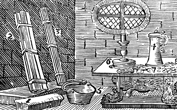Из олова делают чаши (кружки) (4); из меди – котлы (5); из латуни – подсвечники (6); из – серебра – талеры (7); из золота – червонцы (дукаты) и золотые гульдены (8). Живое серебро (ртуть) всегда жидко и разъедает металлы.