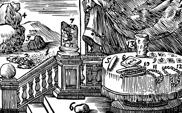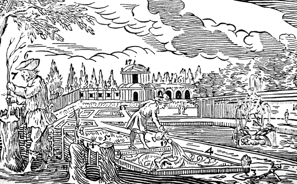 Сад ограждает труд человека (плотной) стеной (10), сложенной из камней (11), забором из кольев (12), досками (13), плетнем (14), сплетенным из кольев и хвороста; или же его ограждает природа кустарником и терновником (15).
