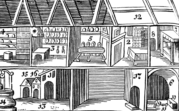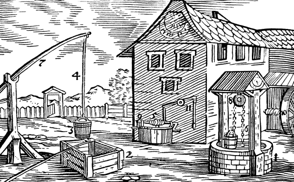 Когда не хватает источников, выкапывают колодцы (1) и окружают их срубом (2), чтобы в них кто-нибудь не упал. Отсюда черпают воду ведрами (3), которые висят или на шесте (4), или на веревке (5), или на цепи (6). Делают это при помощи или журавля (7), или блока (8), или ворота (цилиндра 9) с ручкой, или колеса (10), или, наконец, насоса (помпы 11).