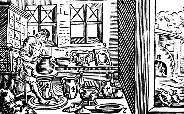 Гончар (1), сидя над гончарным кругом (2), выделывает из глины (3) горшки (4), кувшины (5), сосуды на трех ножках (6), блюда (7), глиняные вазы (8), печные кафли (9), покрышки (10).