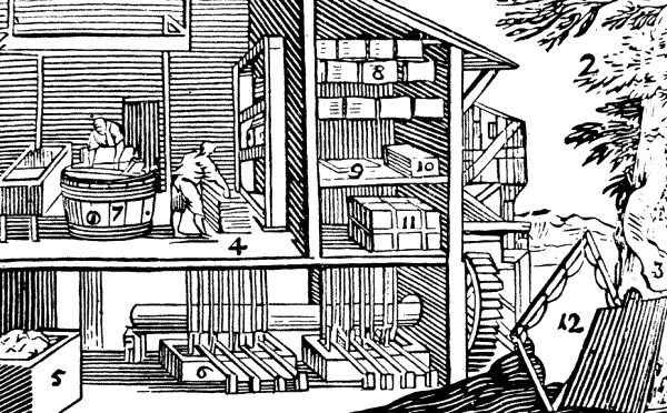 Теперь употребляется бумага, которую изготовляет бумажник на бумажной мельнице (4) из старых тряпок (5), которые растираются в кашицу (6). Последнюю он разливает в формы (7), растягивает в листы (8) и выставляет на воздух для просушки.