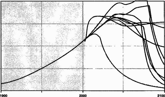 На рисунок наложены все основные сценарии модели WorldЗ, описанные в книге: это позволяет проиллюстрировать широкий диапазон вариантов развития по двум показателям — численности населения и среднему уровню жизни (в котором учитываются как доход на душу населения, так и другие индикаторы материального благосостояния). Большинство сценариев указывают на упадок, однако в некоторых из них обществу удается достичь стабильной численности населения при высоком уровне благосостояния.
