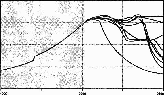 Практически все, что мы написали в «Пределах роста» 30 лет назад, остается правдой. Однако наука и общество за это время достигли нового уровня. Все мы многому научились, перед нами открылись новые перспективы. И статистические данные, и компьютер, и наш собственный опыт показывают, что возможных путей к устойчивому будущему со времен 1972 г. стало меньше. Уровень достатка, который мы могли бы обеспечить всем людям мира, прими мы оперативные меры, уже недостижим. Экосистемы, которые мы могли бы уберечь, уже исчезли. Ресурсы, которыми можно было бы поддерживать благосостояние будущих поколений, уже израсходованы. Однако еще остается множество доступных вариантов, и их можно воплотить в жизнь. На рис. 1.4 показано, как много у нас есть возможностей. Здесь изображены графики численности населения и уровня благосостояния, полученные в девяти основных компьютерных сценариях — мы приводим их в книге[11].