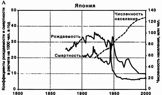 При демографическом переходе сначала снижается коэффициент смертности, и лишь затем коэффициент рождаемости. Демографический переход в Швеции занял около 200 лет, при этом разница между коэффициентами рождаемости и смертности никогда не была большой. За все это время численность населения Швеции выросла меньше чем в пять раз. Япония — пример страны, в которой переход совершился меньше чем за