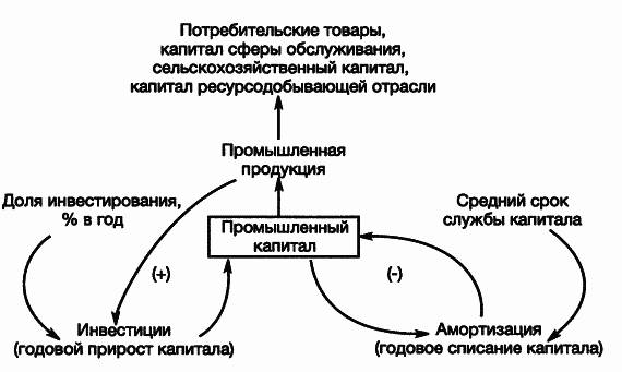 Уже отмечалось, что промышленный капитал за счет самовоспроизводства способен расти экспоненциально. Структура обратных связей, обеспечивающая такое самовоспроизводство, похожа на структуру, определяющую численность населения.