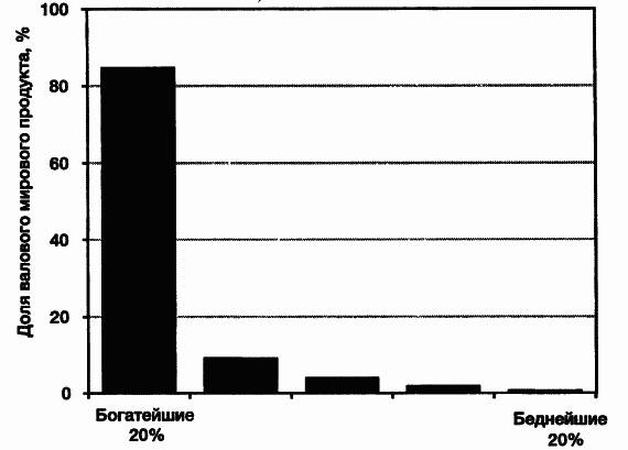 В Программе ООН по развитию содержатся данные о том, что в 1960 г. 20 % мирового населения, проживавшего в самых обеспеченных странах мира, имели доход на душу населения в 30 раз больше, чем другие 20 % населения, проживавшего в беднейших странах. К 1995 г. соотношение средних доходов 20 % богатейшего и 20 % беднейшего населения мира выросло с 30:1 до 82:1. В Бразилии беднейшая половина населения в 1960 г. получала 18 % национального дохода, а в 1995 г. — только 12 %. А 10 % богатейшего населения Бразилии получали 54 % национального дохода в 1960 г. и уже 63 % в 1995 г.[30]. Среднестатистическая африканская семья получала в 1997 г. на 20 % меньше, чем в 1972 г.[31]. Сто лет экономического роста дали миру только чудовищное неравенство в распределении доходов между богатыми и бедными. Два показателя,